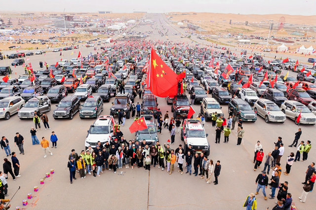 上午10:01,随着指挥车一声令下,这支钢铁长城开始缓缓移动,向着沙漠中的绿洲月亮湖昂扬进发。从空中俯瞰,车队犹如一条蜿蜒的巨龙,在金色的沙海中划出坚定的轨迹。数量值得载入史册的单一品牌车队集结,不仅彰显了“坦克团”越野用户群体的强大凝聚力,更以这种独特的方式,向伟大的祖国母亲献上来自中国越野人最崇高的敬意。